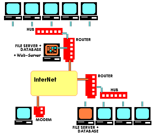 どちらかのデータベースコンピュータにWEB-SERVERを実装しておくことでもう一方のデータベースからのデータ送信、MODEMにつながった単独の端末からの情報を受信しストックして、ブラウザをとおして3箇所全てのコンピュータからのデータ閲覧が可能になります。