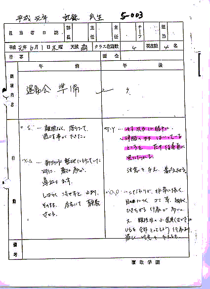 顔を見るととっさに出て行く。 宿直日誌より記録者 野村祐治
