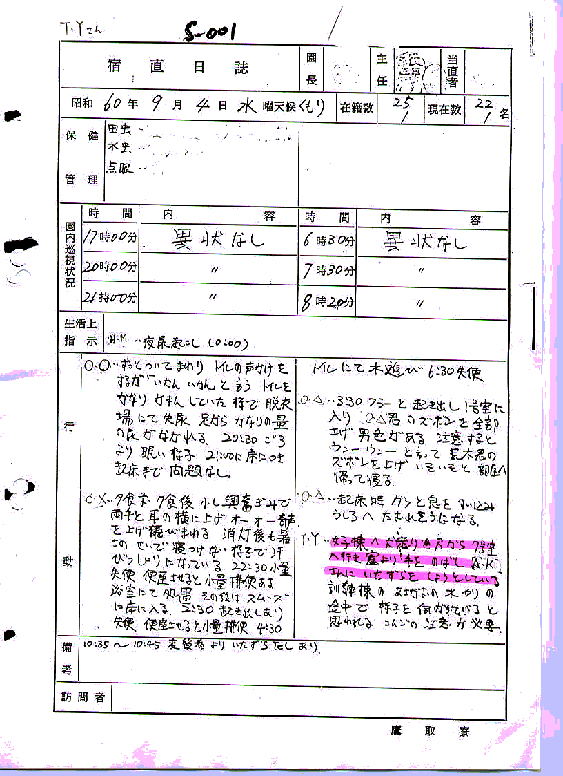 ある。また当所より仲の良い男子園生と夜電気を消して何やらしているが、前入所施設の職員の