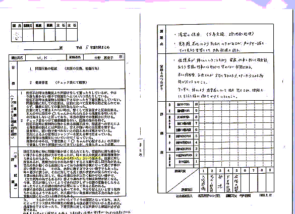 平成2年9月16日に車に傷をつけてまわった事をきっかけに精神科治療を受けた。頻繁に起こる暴力的なことに対し、対応として行うようになったが、2年後よりかなり落ち着きが見られ出した。本人が好む人へのお世話に対して、職員はそれを伸ばすように配慮し、何か悪い事をした場合には、叱るという区別をつけてきた。暴力的な内容としては、叩くにしても、力いっぱい叩き大きな怪我をさせることはなくなり、日常で挨拶のように誰でも叩いていた行為も減少していった。Kさんの場合、第一の改善点としては医療行為が入りそこから指導員の指導が加わり、大きく変化したといえる。