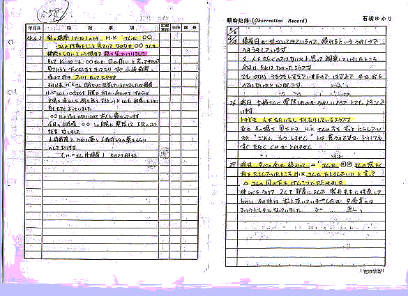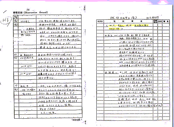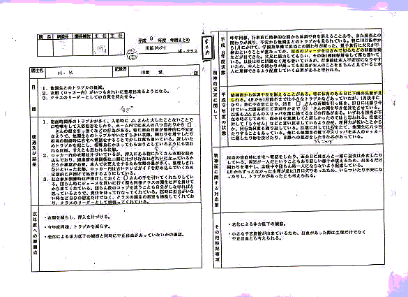 毎日のように周囲へのちょっかいが目立ち、押す・叩く等の行為が続いている。自 宅との電話連絡も保護者の方が留守であることが多く、また、面会日も保護者不参加であった事が度々ありその事でのトラブルもあっている。突発的なトラブルも多かったことで精神的な不安定さが窺える。 *暴力行為〜26回