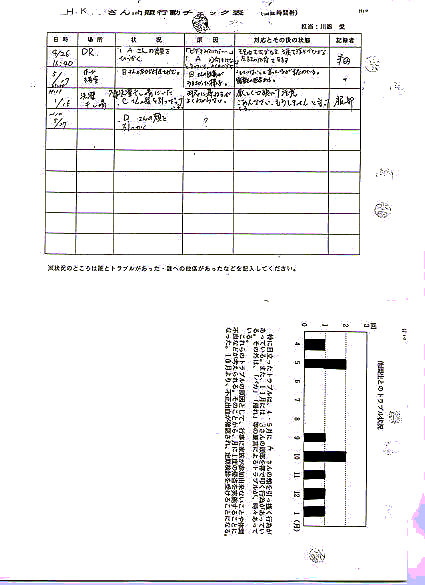 宿直時間帯のトラブルが多く、入浴時に口喧嘩をして入浴拒否をしたり、ホーム内では八つ当たりから他者の顔を引っかく等の行為がある。特に面会日前は精神的に不安定なようで、トラブル・いたづらともに多い。寂しさからトラブルを起こして指導員にかまってもらおうとしているようにも思われる。 *暴力行為〜2回