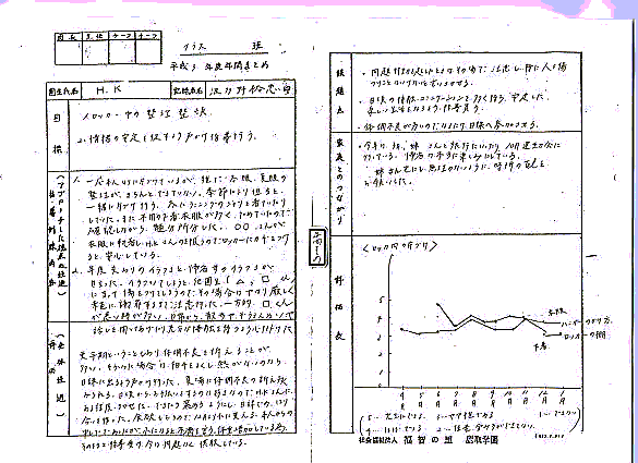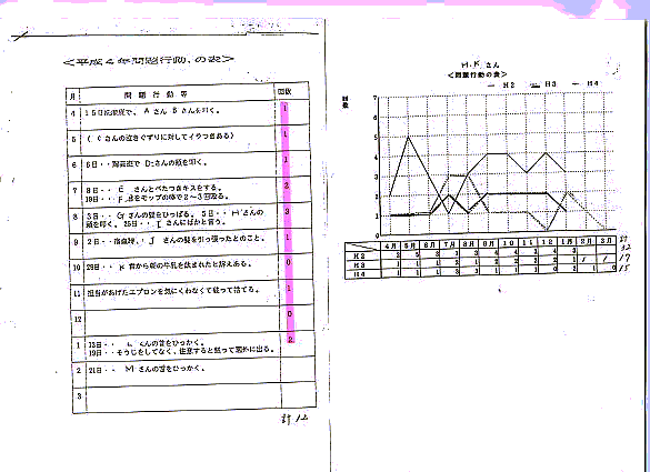 担当への甘えが強く見られており、本人からのべたついた甘えが目立っている。本人の年齢から来る体調不良やいらつきの為、トラブルも時々見られている状態。特定した他者への他傷が目立っている。注意を行う職員に対して暴力を振るうこともある。6月より精神安定剤の投薬を開始し、以後少しずつ暴力行為の回数は減ってき、精神的なものからくる頭痛の訴えも殆どなくなる。9月に本人のトラブルを注意した担当の車に傷をつける行為がある。行事前のいらつきは見られ、保護者への電話や趣味を生かしながら発散を図っている。 *精神安定剤投薬開始 *暴力行為〜12回 *担任の車に傷をつける