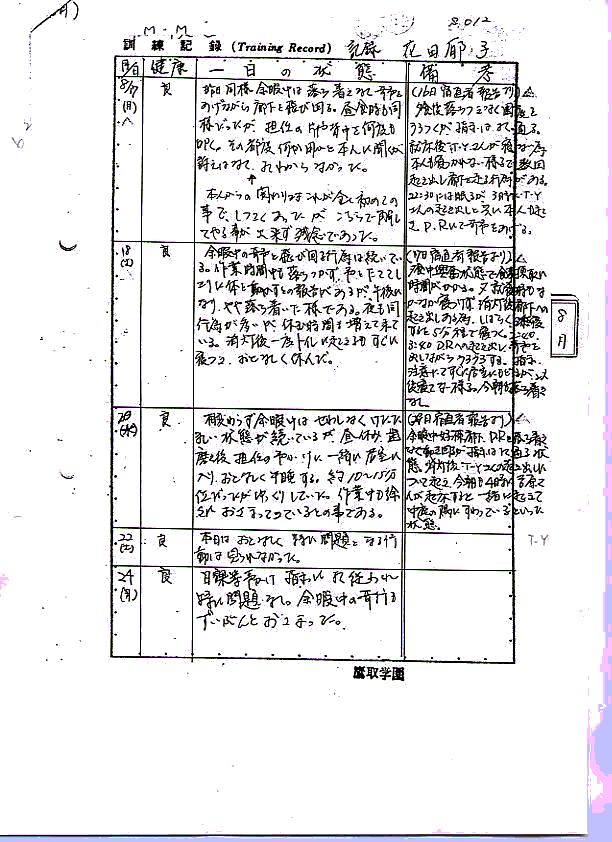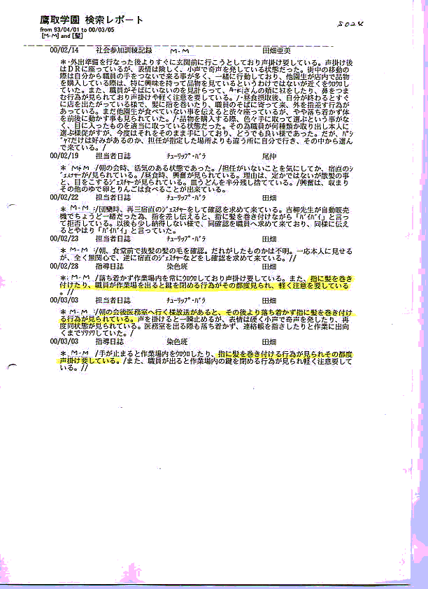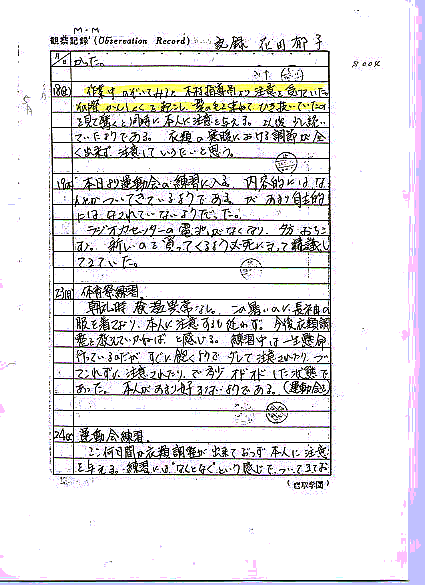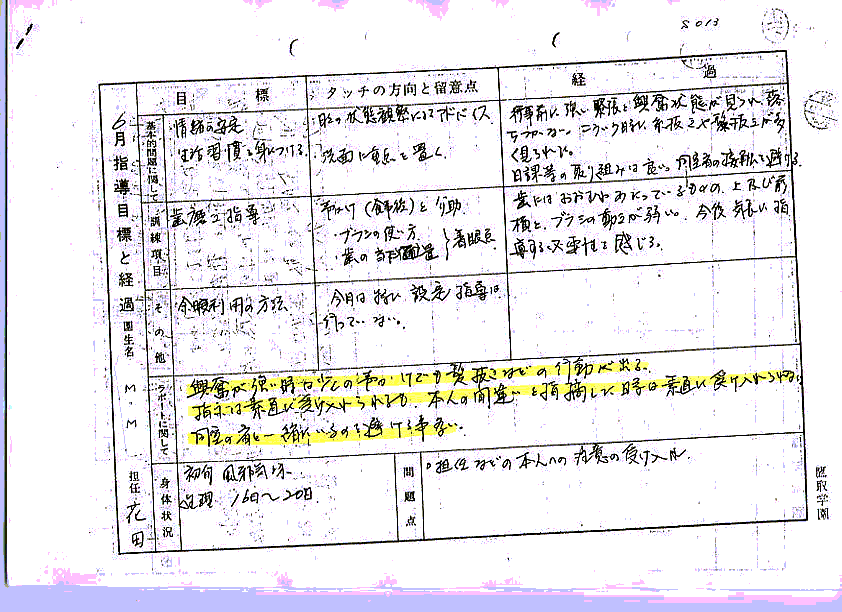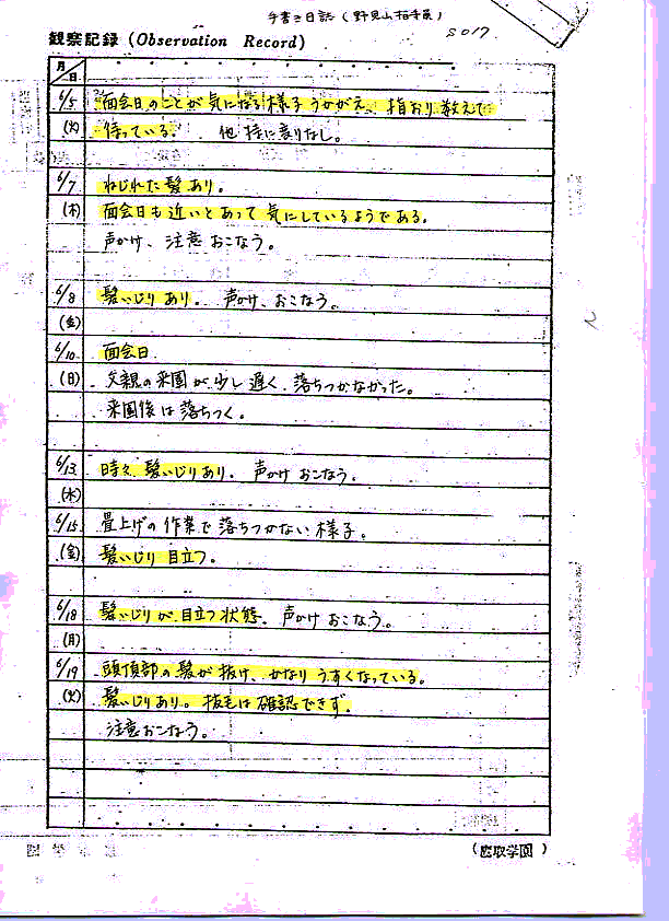 口うるさく言う園生(S・Tさん・S・Fさん)の声掛けを嫌がる傾向にある様で、何か言われると興奮し押したり、しこを踏む行為が見られる。相手が他傷行為をしない限りは奇声を発す事もなく、本人も強気の姿勢で向かって行っている。髪抜きまではいかないが、精神状態が不安定な時に髪を触ったり、手持ちぶたさの時も扱っている様である。ボタン契りに関しても同様だが、作業では飽きると暇を持て余す様に行なっている様でもある。 (手書き訓練記録 8)