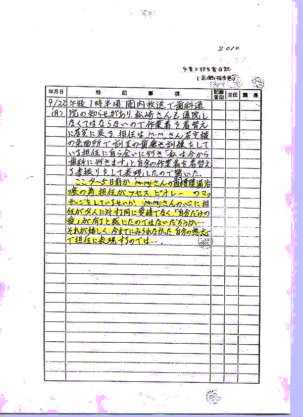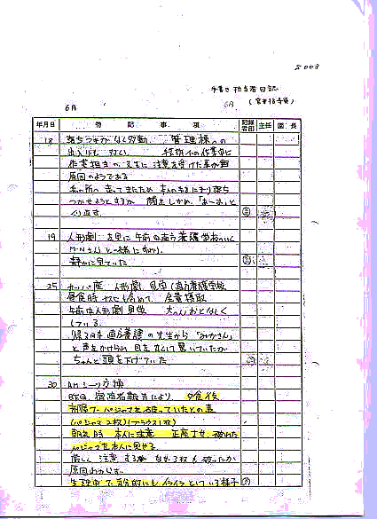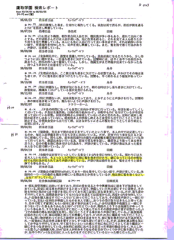 今年度T・Yさんとクラスが別々になったが、K・Yさんと同室になる。K・Yさんは耳が遠い為、テレビの音やカセットの音を大きくし聞く事がほとんどである。本人は大きな音、騒がしい雰囲気を嫌う為か嫌がり、相手を押し倒したり、部屋に閉じ込めたり、テレビのコンセントを抜こうとする行為が見られ、職員の注意に対しても自分の要求が受け入れられない事でしこを踏んだり、自分の意思が通らない時は、指示を受け入れない事もあった。同室の為かその事が原因でのけんかが多く見られている。