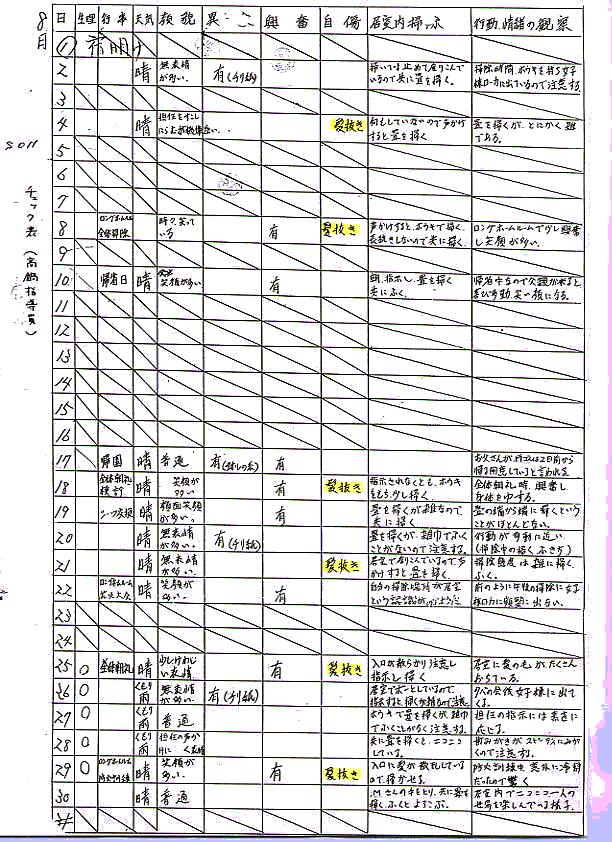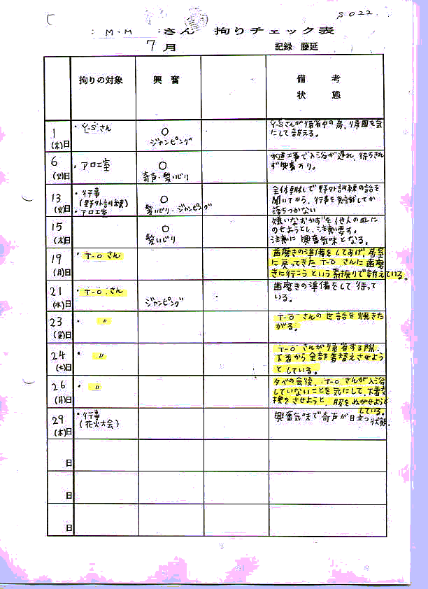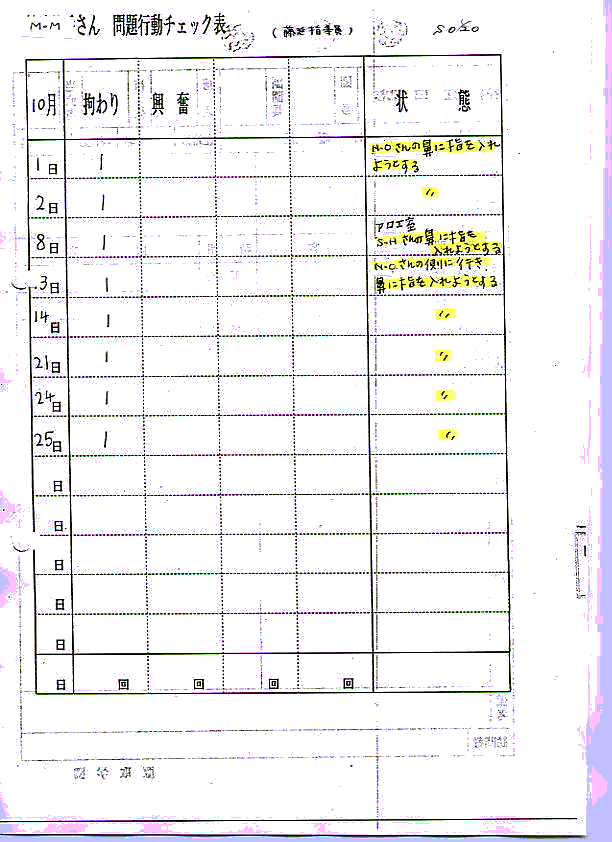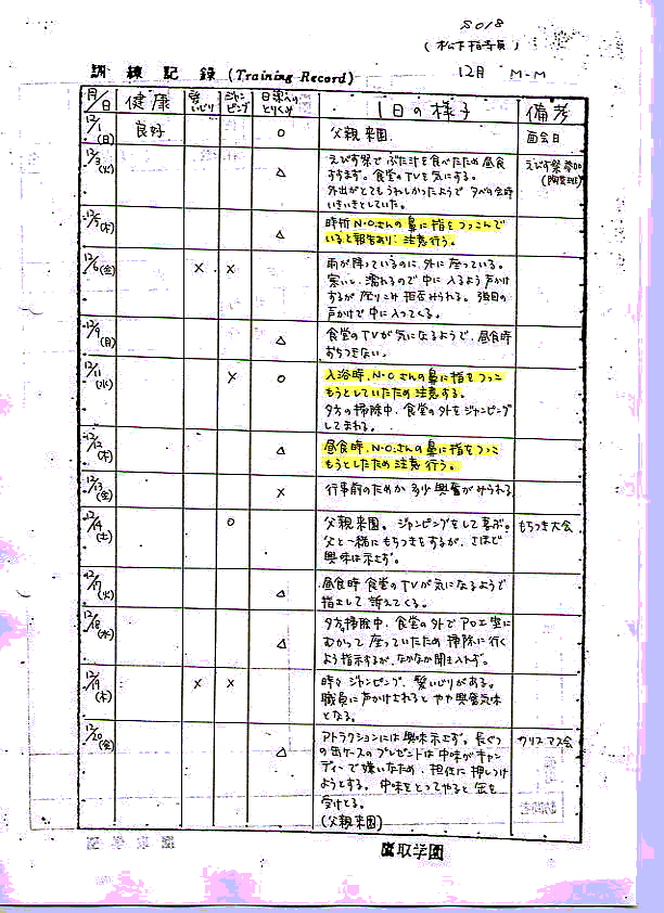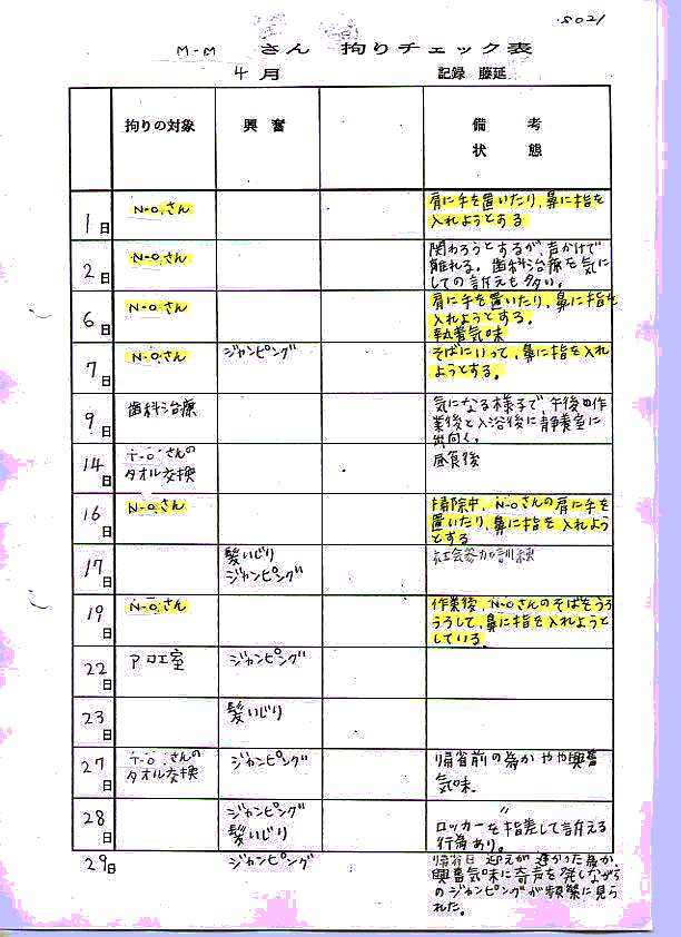 通常の日課の場合は比較的落ち着いているが、帰省前や行事前は落ち着かず、興奮しながら指を折り確認して来る事や、髪いじり、ジャンピングが見られる。また、行事前の興奮で嘔吐、熱発する事も数回あり。本人の気になる物、事に関して職員に聞いて来る事が多く、8月頃より珍しく宿直者の後追いも見られる様になる。また、12月頃より食堂で隣の席になった園生(N・Oさん)に興味を示す様になり、N・Oさんの鼻に指を入れる行為が見られ出している。 (手書き行動記録 18)