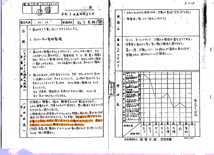 他園生(K・Nさん)や職員から同じ事を何度も指示されたり、注意されると興奮し、大声を出す行為が見られている。口うるさく言われる人からの関わりを大変嫌うが、その他の人との関わりも嫌う為、コミュニケーションが全くとれない状態。本人も上手く対応出来ない事での不満からか、破衣行為が見られている。問題に対しては本人の手を取り、正座をさせたうえでゆっくり話しをする様にすると、少しづつ落ち着く事が出来ている。破った衣類は必ず自分で持って来てから訴える為、注意後、毎回修繕し渡す事としている。この年は服破りの他に2度の自傷行為(抜気)と衣類のボタン契りが始めて見られ出している。