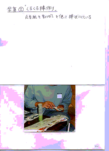 あんでるせん手芸では、広告紙を丸めて作るくるくる棒作り(写真A)は問題ないが、それを編む際は縦芯の間隔を調整できないため、増し芯の際に支持を要す。この作業には少し飽きがみられだす。