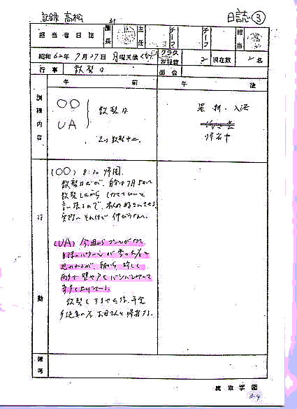 テレビゲームに関心を示すため余暇活動としておこなわせる。5月当初はコントローラーのレバーを適当に動かすのみだったが、朝起き抜けからテレビゲームに取りかかるほどで、7月頃にはかなり上達してくる。11月頃にテレビゲーム熱が冷めてくる。その他、ロングホームルーム時に絵を描かせてみる。細かな部分まで写生できるが、絵を描くことを積極的に楽しんでいるといった感じは受けられない。