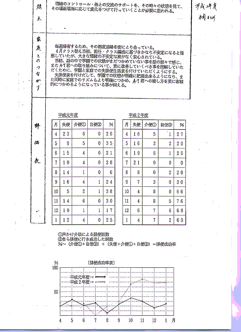 た、軟便状態の際の失便も続いている。担任への関わり(紙の匂いを嗅ぐ)が多くなり