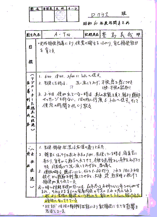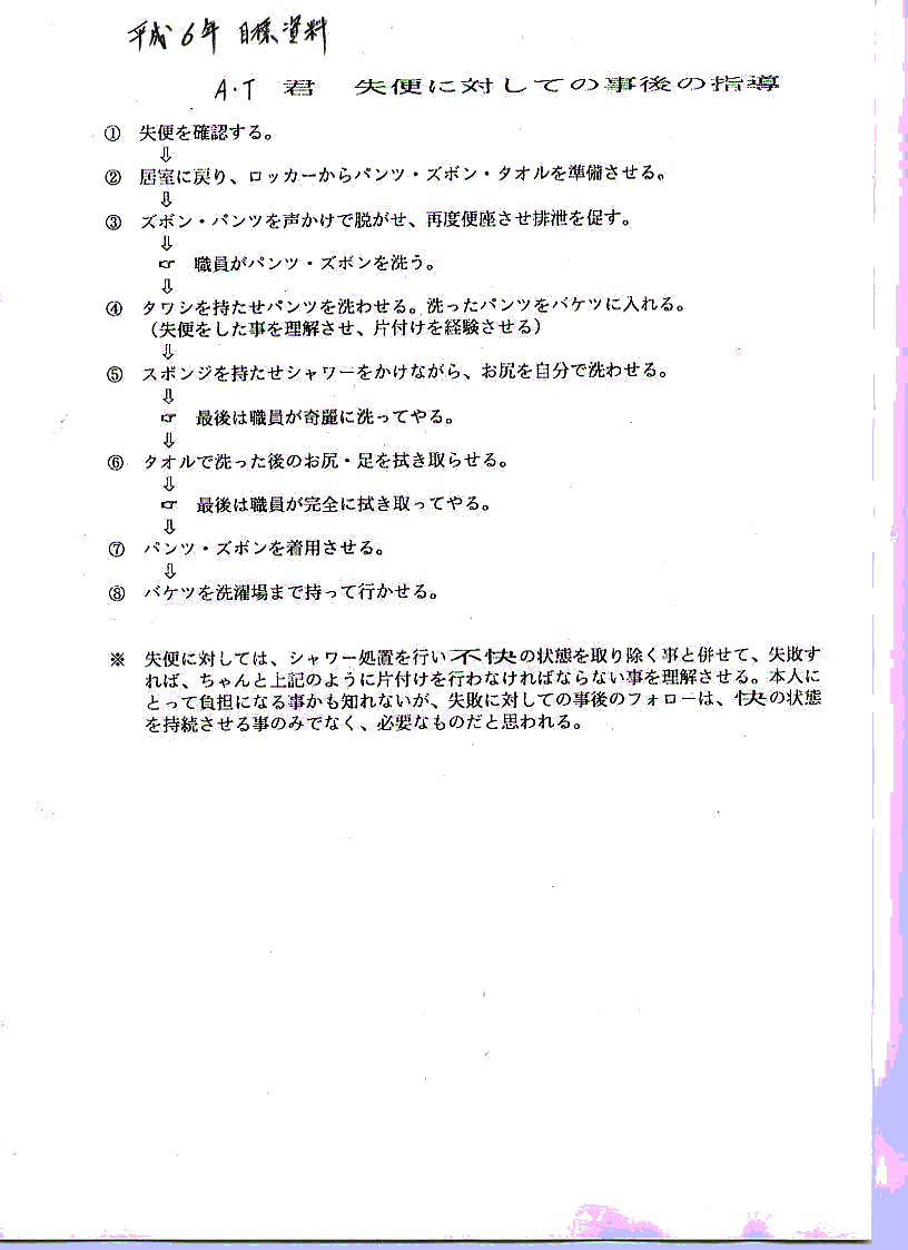 昭和56年4月に入所。失便が多く漏便状態。トイレに誘導しようとしても動かず、