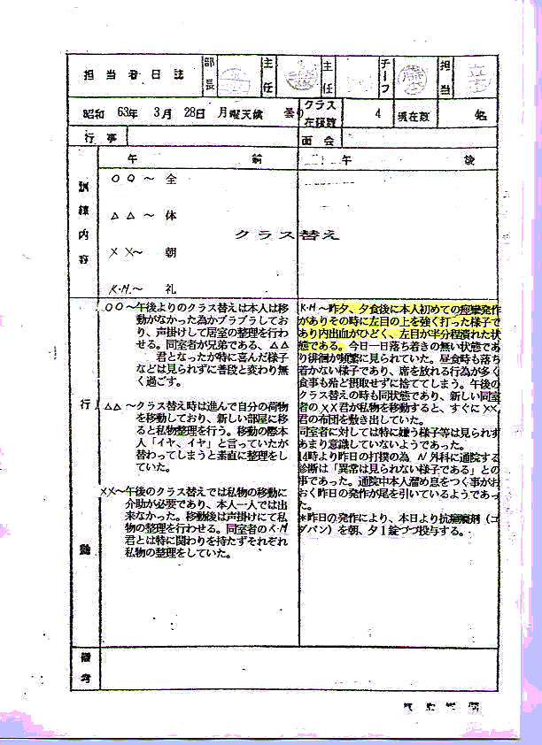 運動会・学園祭・クリスマスなどの大きな行事で職員が残業をすることが多くなったり、作業・訓練が中止で余暇利用になるなどの日課の変更や長期帰省(5月・盆・正月)前後になると不安定になっている。特に長期帰省後、学園に戻ってきてから学園の日課に慣れるのに3週間位を要しており、奇声・ジャンピング(興奮して飛び跳ねる)・自傷(壁に頭をぶつける)などか見られている。しかし、前年度同様に便塗り・首絞めなどの行為は殆ど見られなくなっている。